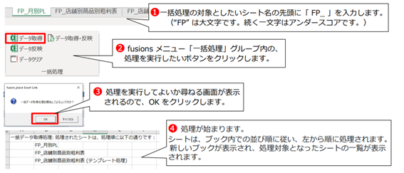 「データ取得と反映」を選んだ場合には、シートごとに、まずデータ取得が行われ、 次にデータ反映が行われます。